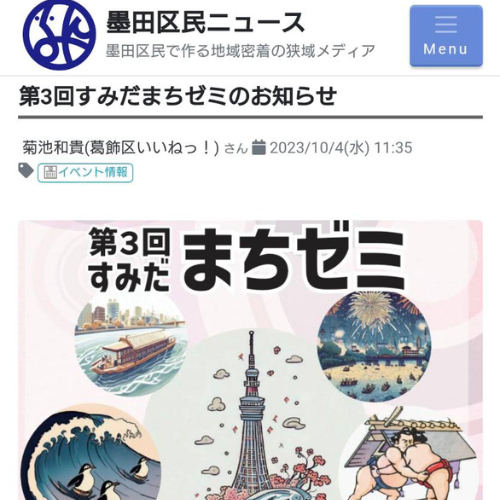 墨田区の地域情報サイト「すみだノート」は、人やイベント、お店や企業のご紹介、住民の健康等を通じて墨田区の活性化と暮らしを応援できる情報を発信しています。